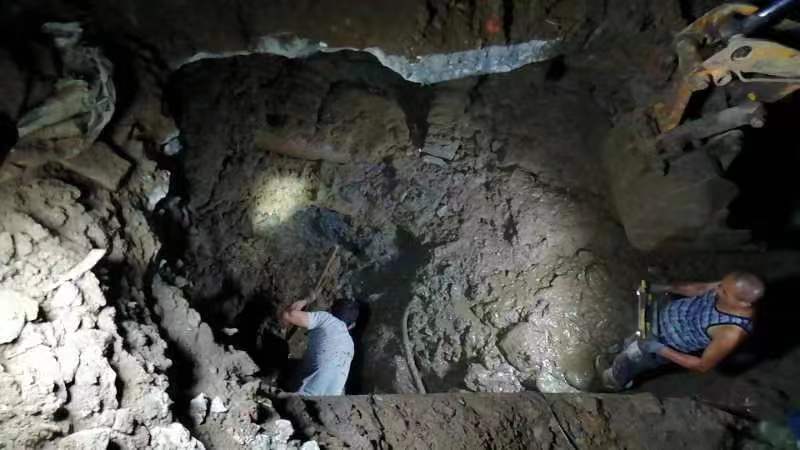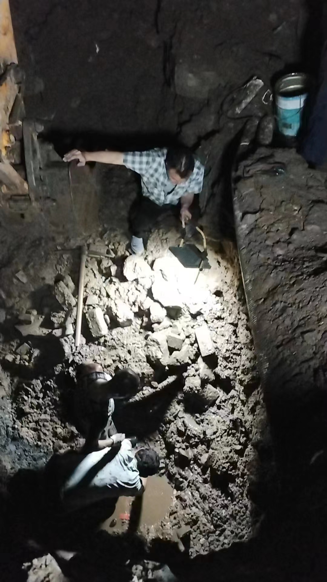 他們跳入3米深坑,利用鍬、鏟等工具進(jìn)行挖掘。施工中多次出現(xiàn)塌方,搶修工作艱難進(jìn)行,當(dāng)挖至4米多深時終于發(fā)現(xiàn)漏點并及時修復(fù)。在修復(fù)試水過程中,東都屹景中區(qū)DN110管線也發(fā)生破裂。當(dāng)時已經(jīng)是10日早6點,搶修人員已連續(xù)工作16個小時。夏日炎炎,為確保施工人員安全,處領(lǐng)導(dǎo)指揮現(xiàn)場二隊、三隊維修人員立即撤離,調(diào)派維修一隊繼續(xù)施工,6小時后修復(fù)漏點,恢復(fù)供水。